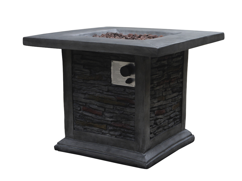 Create a sophisticated and warm space in your backyard with the Outdoor Grey Stone Fire Pit with Lava Rocks. The rustic inspired neutral grey stone look makes for an inviting ambience and beautifully complements the wood-like top in a harmonious way. The heat is controlled by a propane tank that can be conveniently stored inside the closure. An easy to use control panel helps in igniting and keeping the flame in check. The unit also includes decorative lava rocks. Rejuvenate your backyard space with this stone inspired fire pit that serves as an elegant centerpiece as well. 23.62″ x 29.92″ x 29.9″