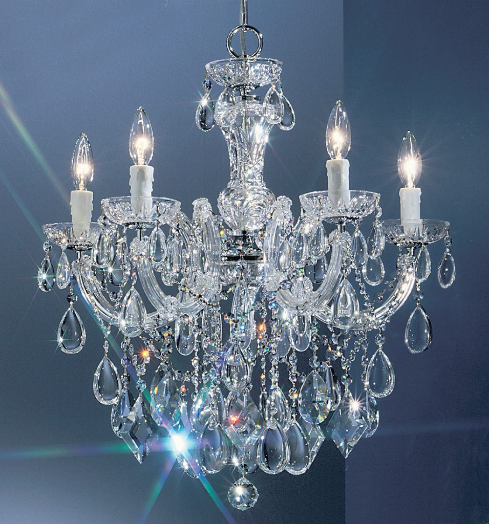 This series depicts a new twist to the traditional Maria Theresa look. Utilizing the standard frames but trimming them with contemporary Crystalique™ crystal “oysters,” “kites,” and “tear drops,” up-dates the Maria Theresa style chandeliers. The overall effect is quite stunning and will fit many of today’s more modern décor. In the Maria Theresa tradition, the metal frames are encased with blow glass panels and glass dishes.