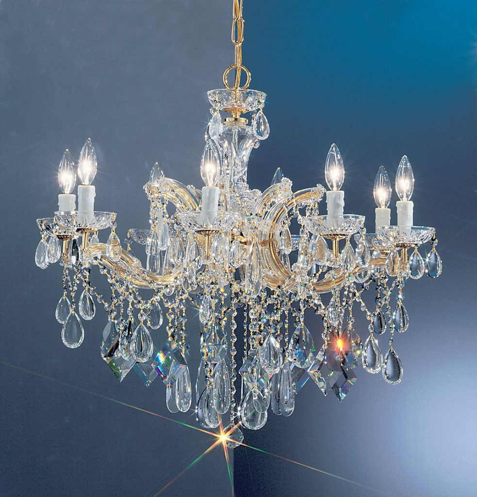 This series depicts a new twist to the traditional Maria Theresa look. Utilizing the standard frames but trimming them with contemporary Crystalique™ crystal “oysters,” “kites,” and “tear drops,” up-dates the Maria Theresa style chandeliers. The overall effect is quite stunning and will fit many of today’s more modern décor. In the Maria Theresa tradition, the metal frames are encased with blow glass panels and glass dishes.