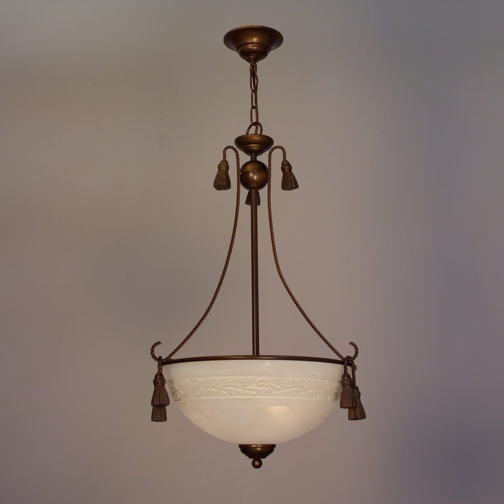 The Rope and Tassel series are Italian made iron frames with metal ropes tipped with cast resin tassels and faux “alabaster” glass. The marbleized glass is embossed with a subtle floral pattern whose detail is enhanced with a white on white patina applied in the engraved detail.
