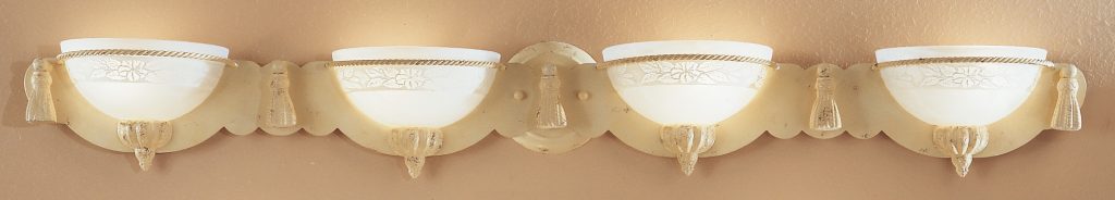 The Rope and Tassel Vanity Bars are Italian made iron frames beautifully detailed cast resin tassels. The faux “alabaster” glass is marbleized and embossed with a subtle floral pattern whose detail is enhanced with a white on white patina applied in the engraved detail.