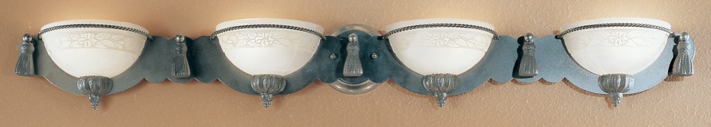 The Rope and Tassel Vanity Bars are Italian made iron frames beautifully detailed cast resin tassels. The faux “alabaster” glass is marbleized and embossed with a subtle floral pattern whose detail is enhanced with a white on white patina applied in the engraved detail.