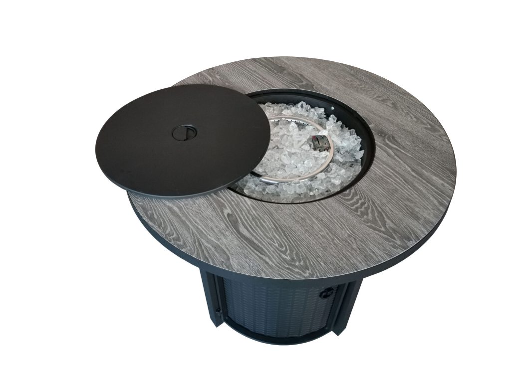 Create a warm and cozy ambience with the Round Black Metal and Tile Fire Pit with Glass Rocks. The classy and compact framework of the black rattan inspired metal dazzles exquisitely while beautifully complementing any outdoor theme or décor. The rattan weaved sides accentuates the contemporary aspect while the weathered wooden lid on top allows for the pit to be converted into a dining table when not in use. The heat is controlled by a propane tank that can be conveniently stored inside the closure. An easy to use control panel helps in igniting and keeping the flame in check. The unit also includes a five pound starter bag of clear fire glass. Aesthetically designed this round fire pit is an excellent conversation starter and equally appealing. 25.6″ x 29.9″ x 29.9″