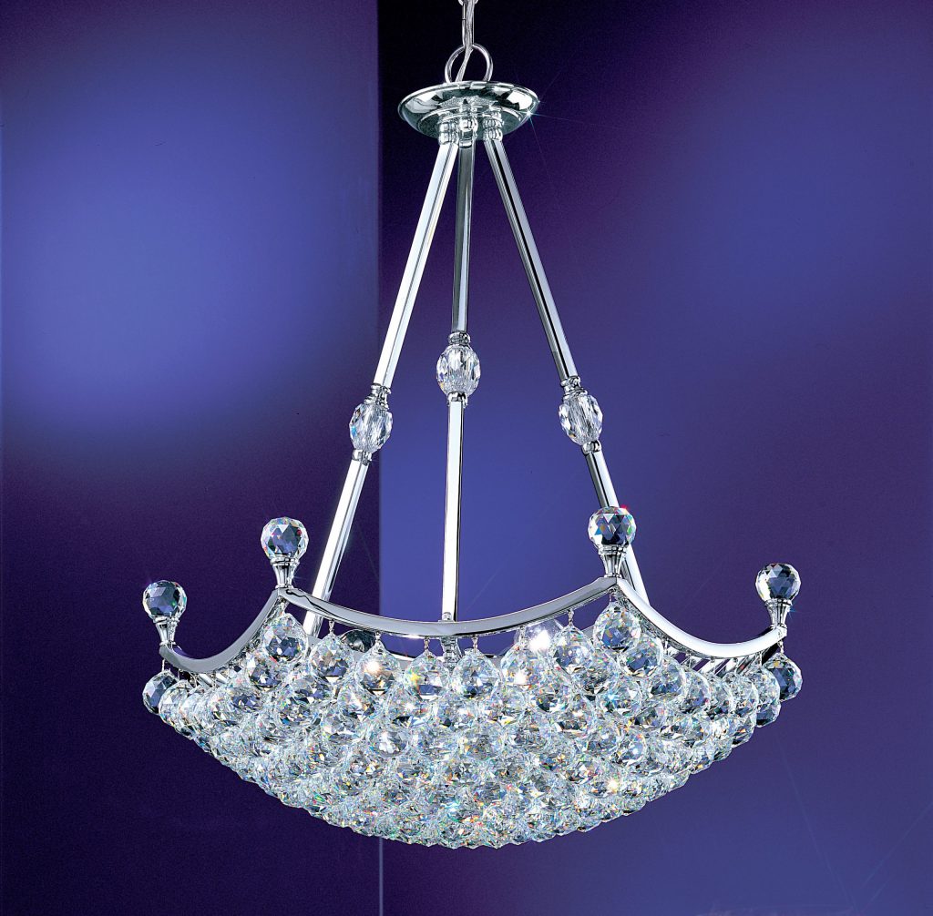 This series offers jewel-like styling. Solid brass frames are finished in mirror-like chrome and lavished with lead crystal spheres. The tight weave of the design closes the bottom so as to hide the inside lights. These cut balls are offered in three crystal qualities. Fixtures are also dual mount. May be hung by chain or flush.