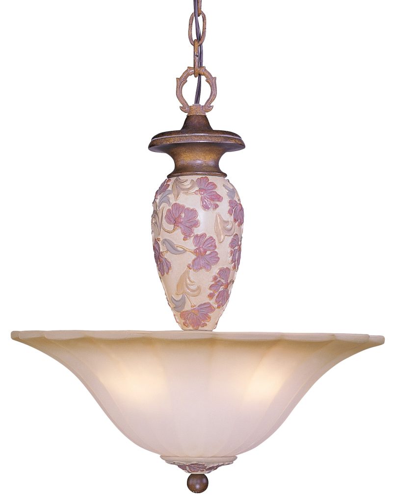 Individually hand painted organic pattern complemented by rich earthy wood tone finish makes this perfect for many settings. Coordinated ivory shades or beautiful large scalloped glass with a soft cream tone complete this broad series which includes everything from a 1 light pendant, dainty boudoir 3 lighter, 2 tier dining chandelier to bath vanity bars. Metal finished in popular Honey Walnut (HW).