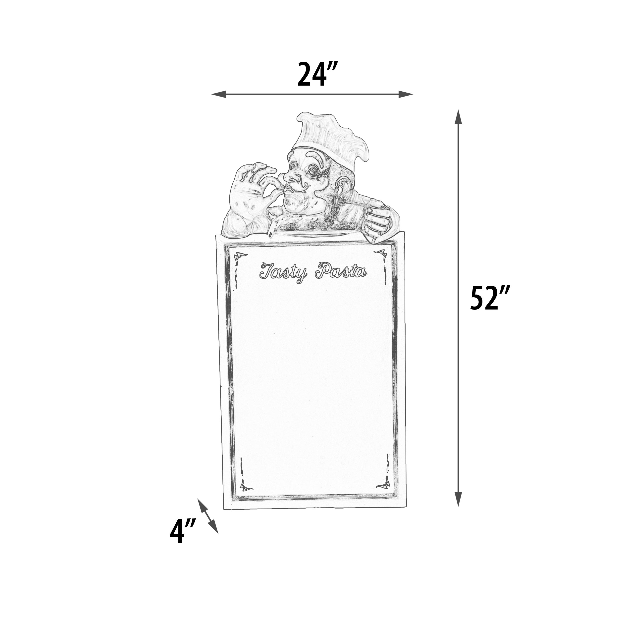 The Tasty Pasta Board 52″ Tall is a commercial quality Menu Board. It offers a Pasta theme and whimsical Italian Chef figure a top large Chalk Board surface for marking daily specials. An item which will generate a return on investment with the ability to generate additional sales, as well as providing a twist of fun to any Italian minded kitchen decor. The item is hand made and hand-painted in mixed materials of Fiberglass and Iron. One of several Menu style Boards available from our Whimsical Treasure Collection by AFD Home. No assembly Required!