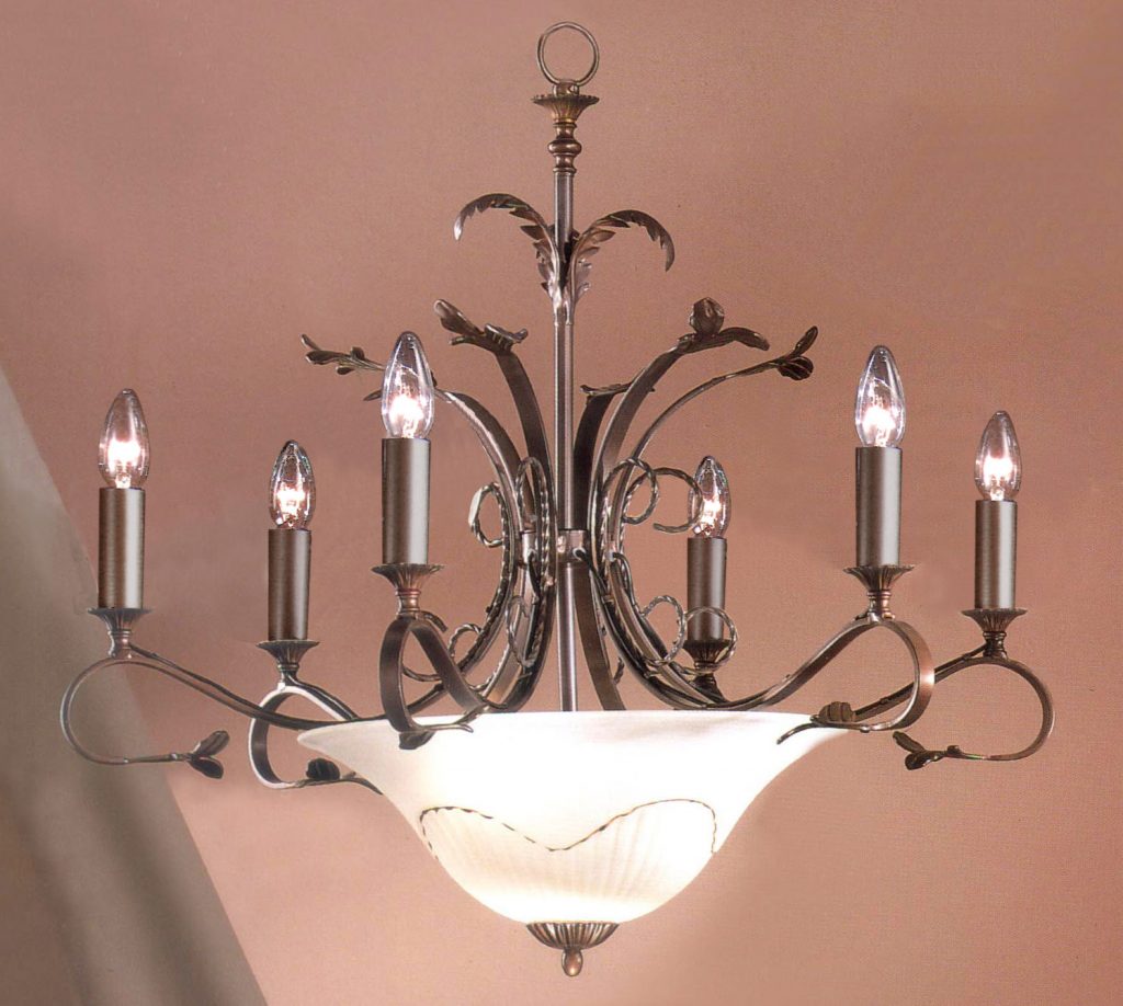 The Treviso series is made in Northern Italy. A place where craftsmen skilled in the art of hand forging metal and blowing glass abound. The framework is tipped with wrought iron leaves and the scavo glass shades have a hand painted line of gold delineating the transition from the smooth part of the glass to the scalloped section. This collection of charming yet affordable wrought iron and scavo glass fixtures will fit the bill where traditional ironwork lighting is needed.