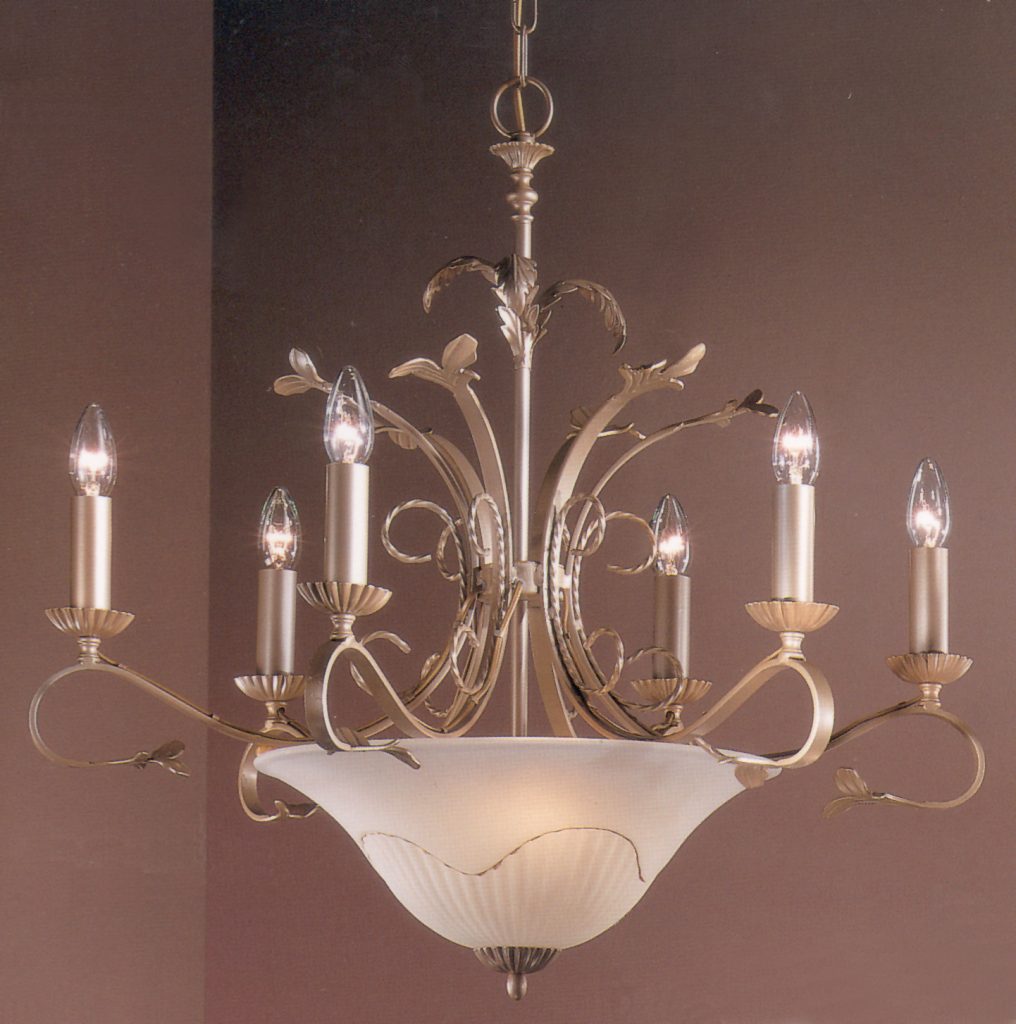 The Treviso series is made in Northern Italy. A place where craftsmen skilled in the art of hand forging metal and blowing glass abound. The framework is tipped with wrought iron leaves and the scavo glass shades have a hand painted line of gold delineating the transition from the smooth part of the glass to the scalloped section. This collection of charming yet affordable wrought iron and scavo glass fixtures will fit the bill where traditional ironwork lighting is needed.