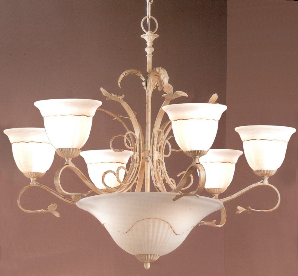 The Treviso series is made in Northern Italy. A place where craftsmen skilled in the art of hand forging metal and blowing glass abound. The framework is tipped with wrought iron leaves and the scavo glass shades have a hand painted line of gold delineating the transition from the smooth part of the glass to the scalloped section. This collection of charming yet affordable wrought iron and scavo glass fixtures will fit the bill where traditional ironwork lighting is needed.