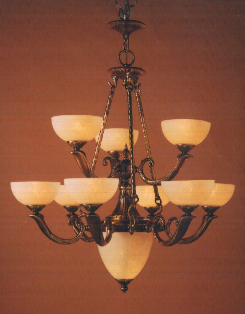 The Valencia Series are solid brass cast fixtures made in Europe. For that subtle, elegant look that is subdued but not suppressed, these empire urn-shaped chandeliers either in single or two tire configurations offer stature to any entryway or dinning room. Finished in a muted 24k gold Matte (GM) or traditional Antique Bronze (ABZ). Fixtures in this series that have a 5 in the 3rd digit (e.g. 5652) have frosted glass shades with a hand cut pattern, those with a 6 in the 3rd digit (e.g. 5662) have genuine alabaster stone shade, that have a 7 in the 3rd digit (e.g. 562) have cream coloers glass shades painted to simulate alabaster.