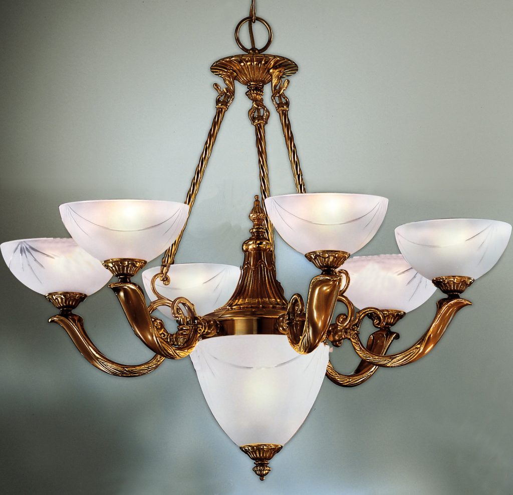 The Valencia Series are solid brass cast fixtures made in Europe. For that subtle, elegant look that is subdued but not suppressed, these empire urn-shaped chandeliers either in single or two tire configurations offer stature to any entryway or dinning room. Finished in a muted 24k gold Matte (GM) or traditional Antique Bronze (AB). Fixtures in this series that have a 5 in the 3rd digit (e.g. 5652) have frosted glass shades with a hand cut pattern, those with a 6 in the 3rd digit (e.g. 5662) have genuine alabaster stone shade, that have a 7 in the 3rd digit (e.g. 562) have cream coloers glass shades painted to simulate alabaster.