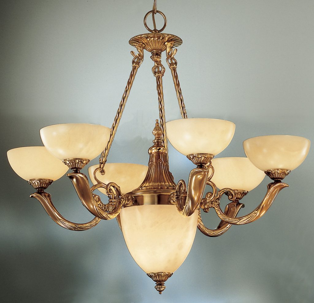 The Valencia Series are solid brass cast fixtures made in Europe. For that subtle, elegant look that is subdued but not suppressed, these empire urn-shaped chandeliers either in single or two tire configurations offer stature to any entryway or dinning room. Finished in a muted 24k gold Matte (GM) or traditional Antique Bronze (AB). Fixtures in this series that have a 5 in the 3rd digit (e.g. 5652) have frosted glass shades with a hand cut pattern, those with a 6 in the 3rd digit (e.g. 5662) have genuine alabaster stone shade, that have a 7 in the 3rd digit (e.g. 562) have cream coloers glass shades painted to simulate alabaster.