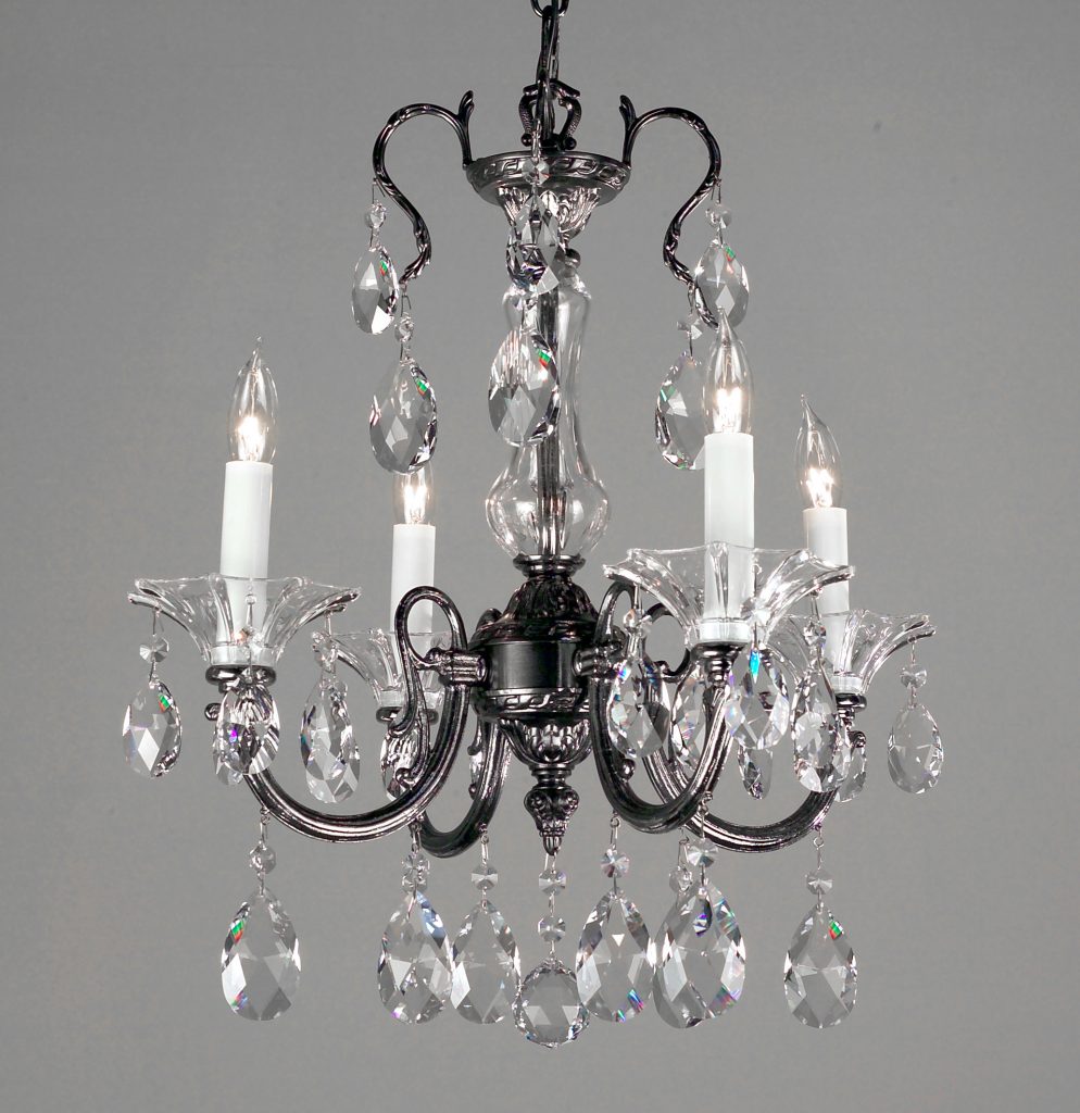 Deep chased Spanish solid brass castings are skillfully assembled with hand-etched 24% lead crystal columns and bobeches making magnificent chandeliers and wall scones. A careful sprinkling of light crystal trim, gives the collection a clean, subtle but elegant look.