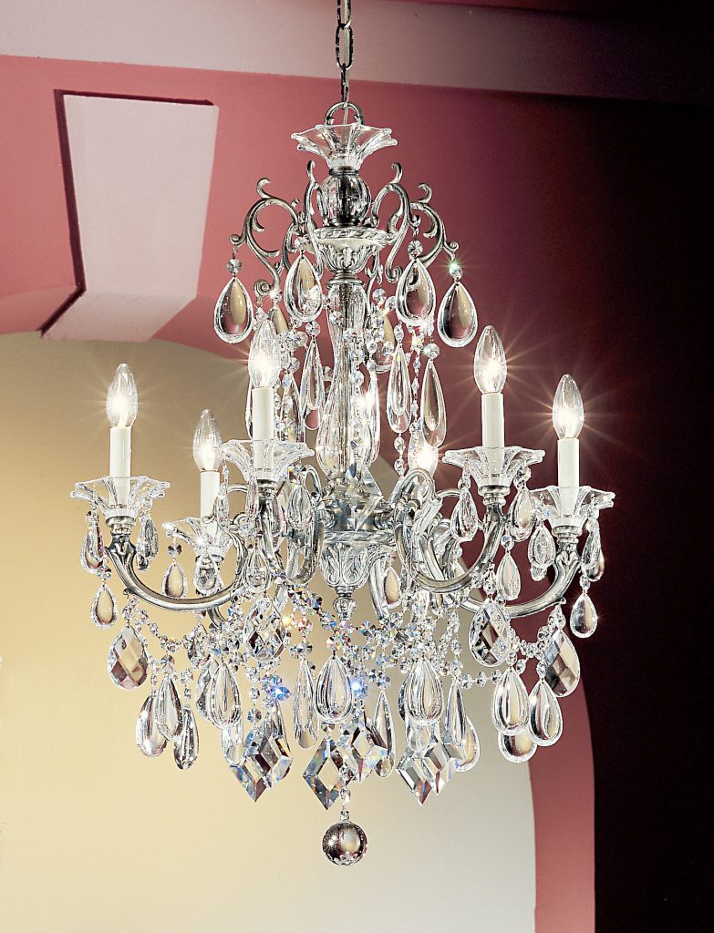 This series depicts an era of prosperity and prestigious living. Hand-etched 24% lead crystal columns, founts and bobeches are interspersed among the heavy chased Spanish castings, and then generously adorned with unique crystal shapes – oysters, kites, almonds – that recreate the style of Italian Renaissance period.
