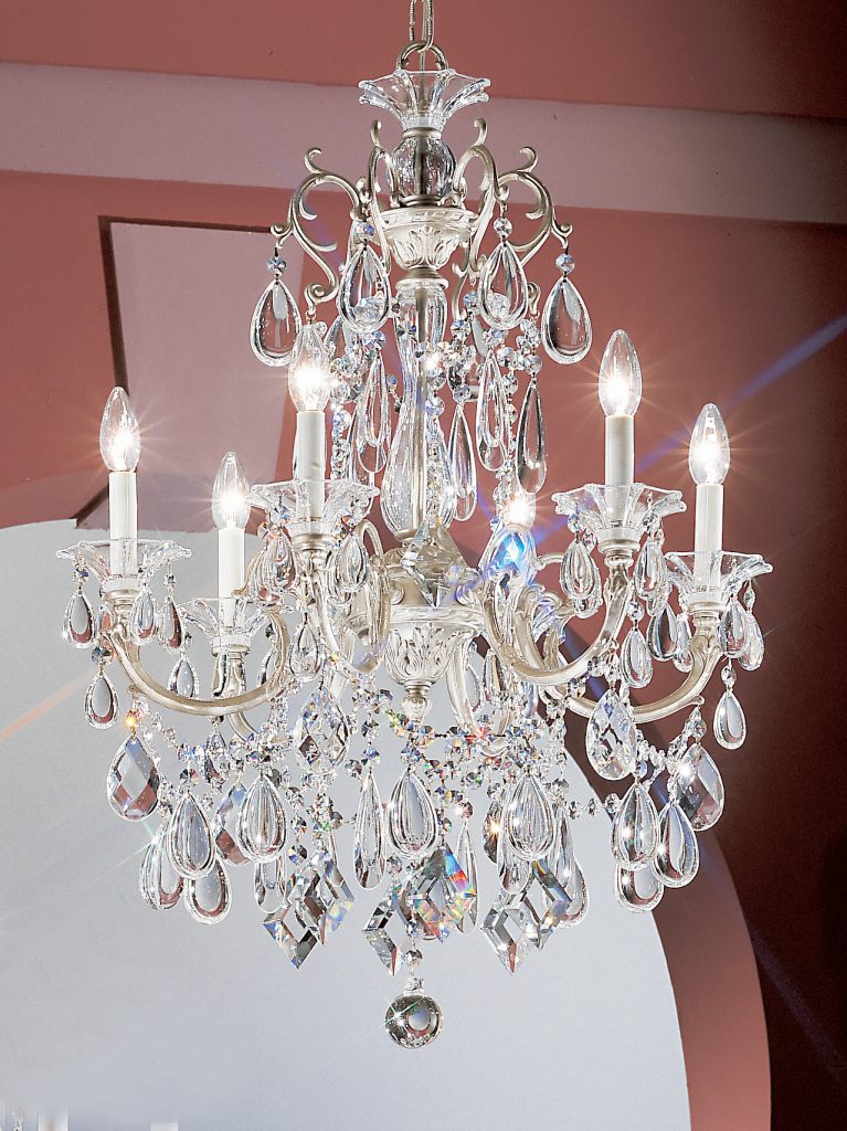 This series depicts an era of prosperity and prestigious living. Hand-etched 24% lead crystal columns, founts and bobeches are interspersed among the heavy chased Spanish castings, and then generously adorned with unique crystal shapes – oysters, kites, almonds – that recreate the style of Italian Renaissance period.