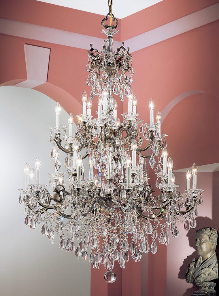 This series depicts an era of prosperity and prestigious living. Hand-etched 24% lead crystal columns, founts and bobeches are interspersed among the heavy chased Spanish castings, and then generously adorned with unique crystal shapes – oysters, kites, almonds – that recreate the style of Italian Renaissance period.