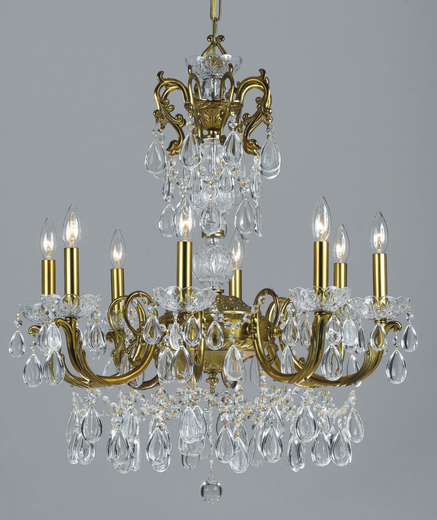 The Vienna Palace series is modeled after the elegant crystal chandeliers found in the Palaces and Ballrooms of Vienna Austria. The crystal drops will not create colors as they are not highly faceted and do not create a prismatic effect. This reflects the early uses of crystal on chandeliers before the time when they had the technology to cut and polish the crystal. These are “instant antiques.” The English Bronze with Gold patina is a painted finish that replicates an aged bonze fixture. The Renovation Brass finish is a plated and antiqued finish mimicking a brass finish that has aged over the years.