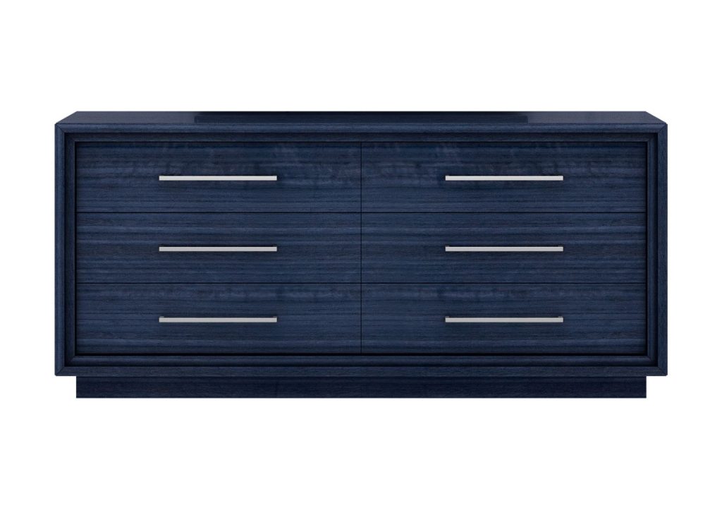 Jewel-toned sapphire lacquer and chrome hardware elevate this double dresser to luxury essentials.