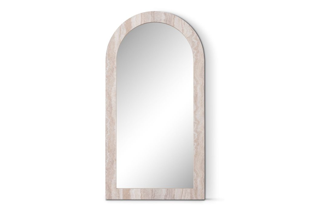 Description Petra Arched Mirror, Fiber Glass Frame, In A Matte Faux Travertine Marble Finish.