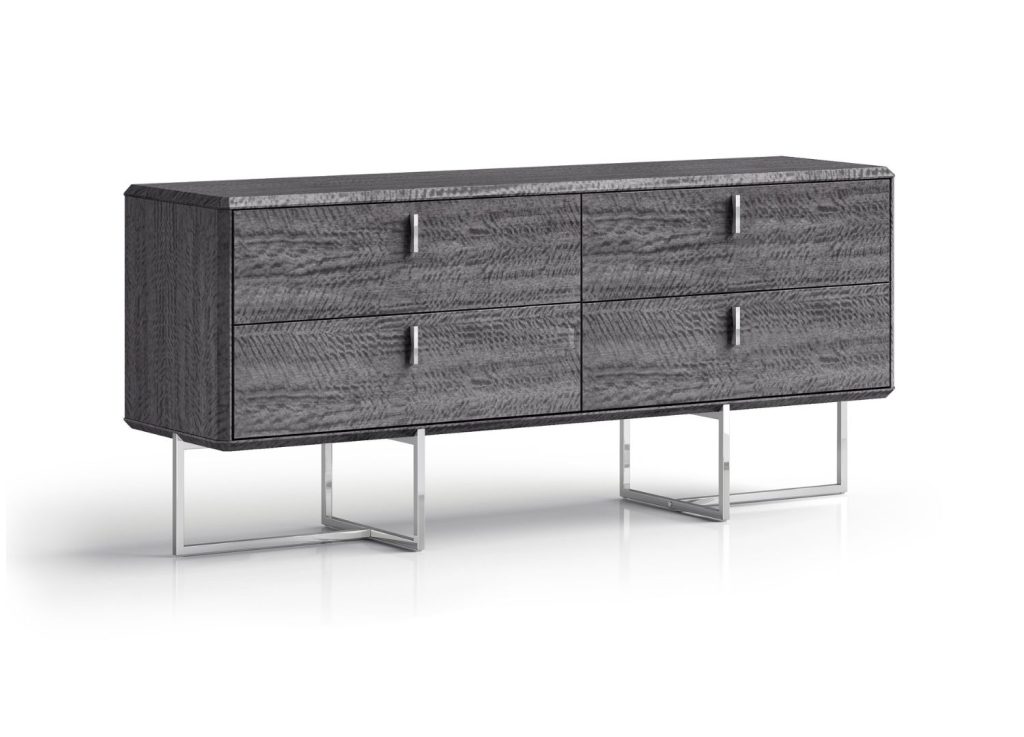 The Chloé dresser brings refined bedroom organization to life with four spacious drawers finished in grey lacquer. Each drawer operates on precision self-closing runners for smooth, silent operation. The pristine lacquered surfaces reflect light beautifully, while polished metal hardware adds refined accents that elevate everyday storage into a design statement.