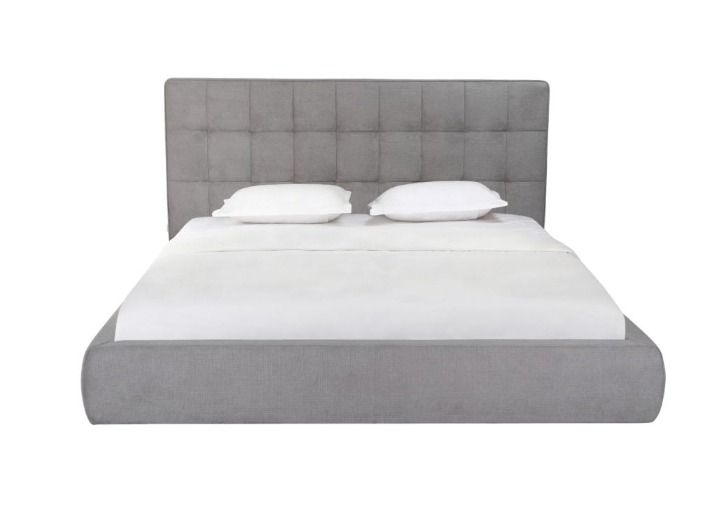 - Bed Size: King fully upholstered in soft grey fabric with padded square-quilted headboard.