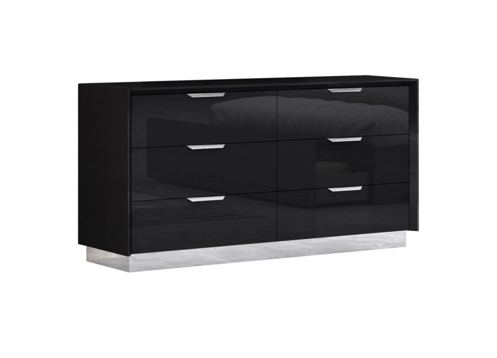 The Navi dresser brings refined bedroom organization to life with six spacious drawers finished in grey lacquer. Each drawer operates on precision self-closing runners for smooth, silent operation. The pristine lacquered surfaces reflect light beautifully, while polished metal hardware adds refined accents that elevate everyday storage into a design statement.