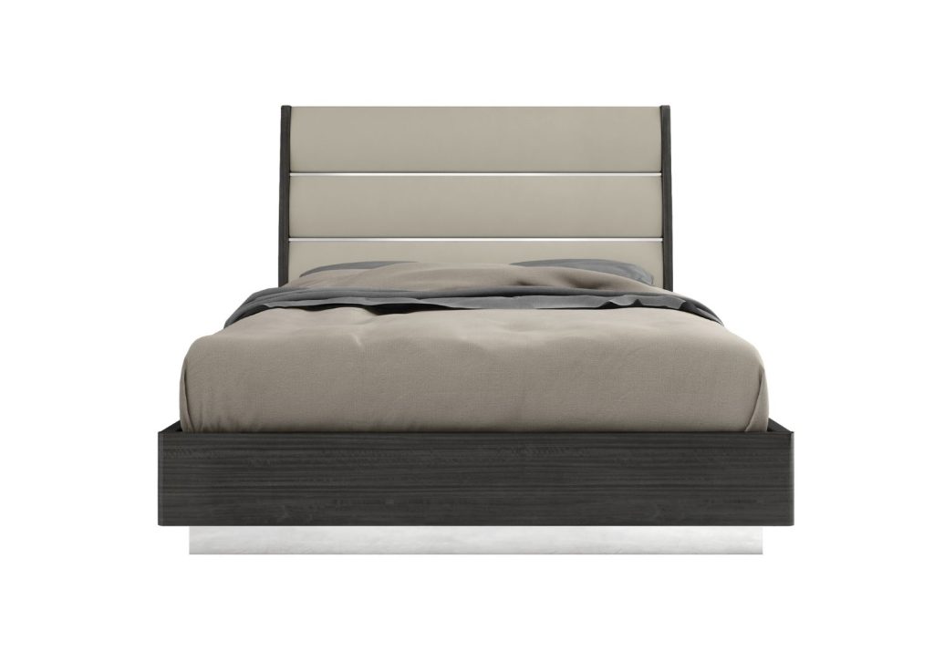 A two-tone lacquer Queen bed with light grey upholstered headboard panels and polished stainless steel base.