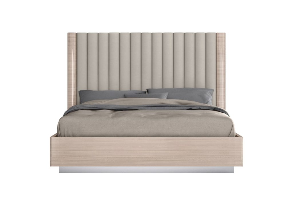 - Headboard: Vertical upholstered panels in beige fabric create architectural rhythm and tactile appeal.