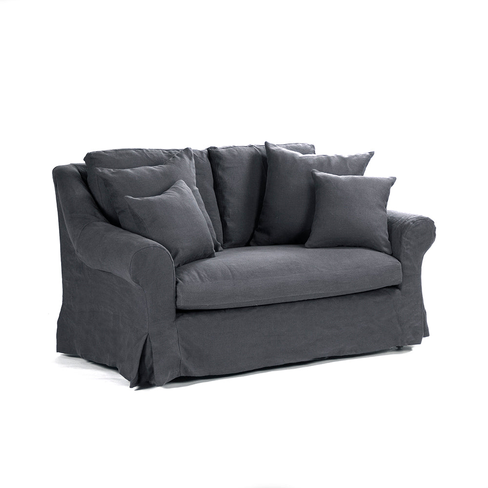 The Albine Settee brings the elegance of its larger sibling to intimate spaces. At 64 inches wide, 35 inches tall, and 38 inches deep, this is a sofa for thoughtful conversation and quiet moments. Navy blue linen upholstery flows over a limed grey oak frame—a combination that feels both classic and refreshingly contemporary. The seat measures 47 inches wide by 31 inches deep with a 19-inch height, while 25 inches of arm depth (or 31 inches with back cushion) accommodates both sitting and reclining. The 26-inch armrest brings hands to rest naturally. Included pillows—two 16-by-16-inch and two 22-by-22-inch—add layers of comfort and visual richness.