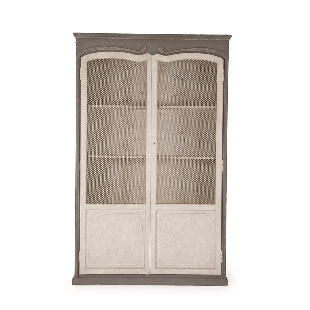 - Details: Chicken-wire glass panels create a curated display effect; functioning brass lock and key add authentic provincial detail and functional elegance