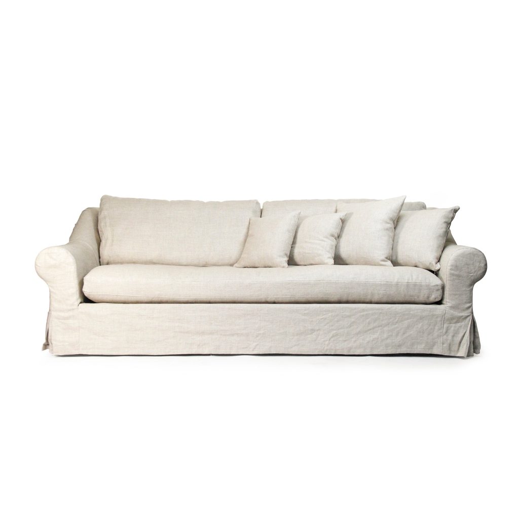 A graceful sofa upholstered in natural linen with a solid oak frame.