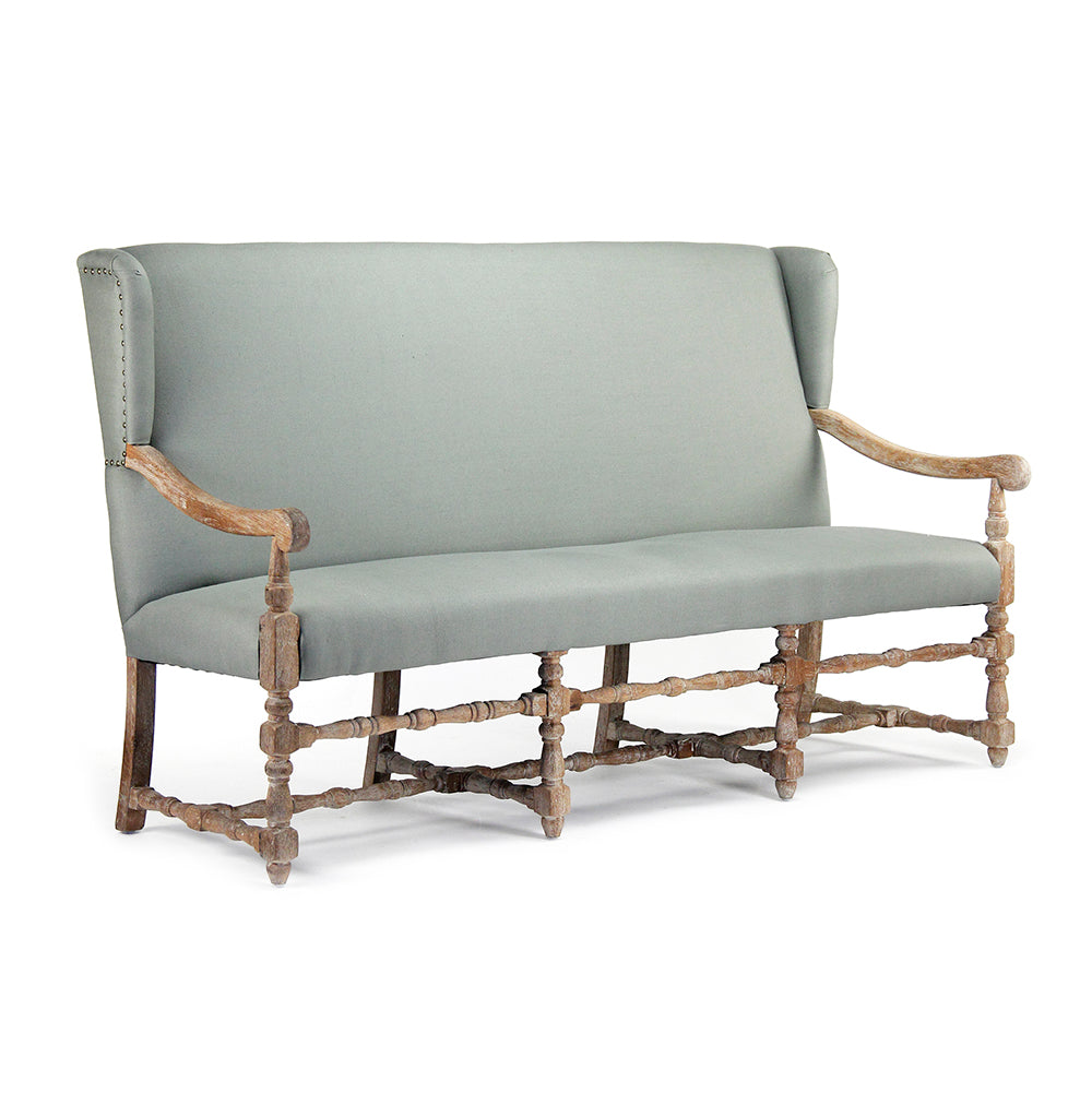 Position this bench in an entryway as an unexpected grand statement, at the foot of an oversized bed, or as generous seating in a master sitting room. The sage linen, a muted green tone, creates a moment of nature-inspired calm without botanical cliché. The 17-inch seat depth provides genuine comfort for extended sitting, while the limed grey oak frame’s pale, weathered tone complements rather than fights the linen’s muted warmth. This is the sort of piece that becomes the centerpiece around which entire rooms are composed—a talisman of considered, generous living.