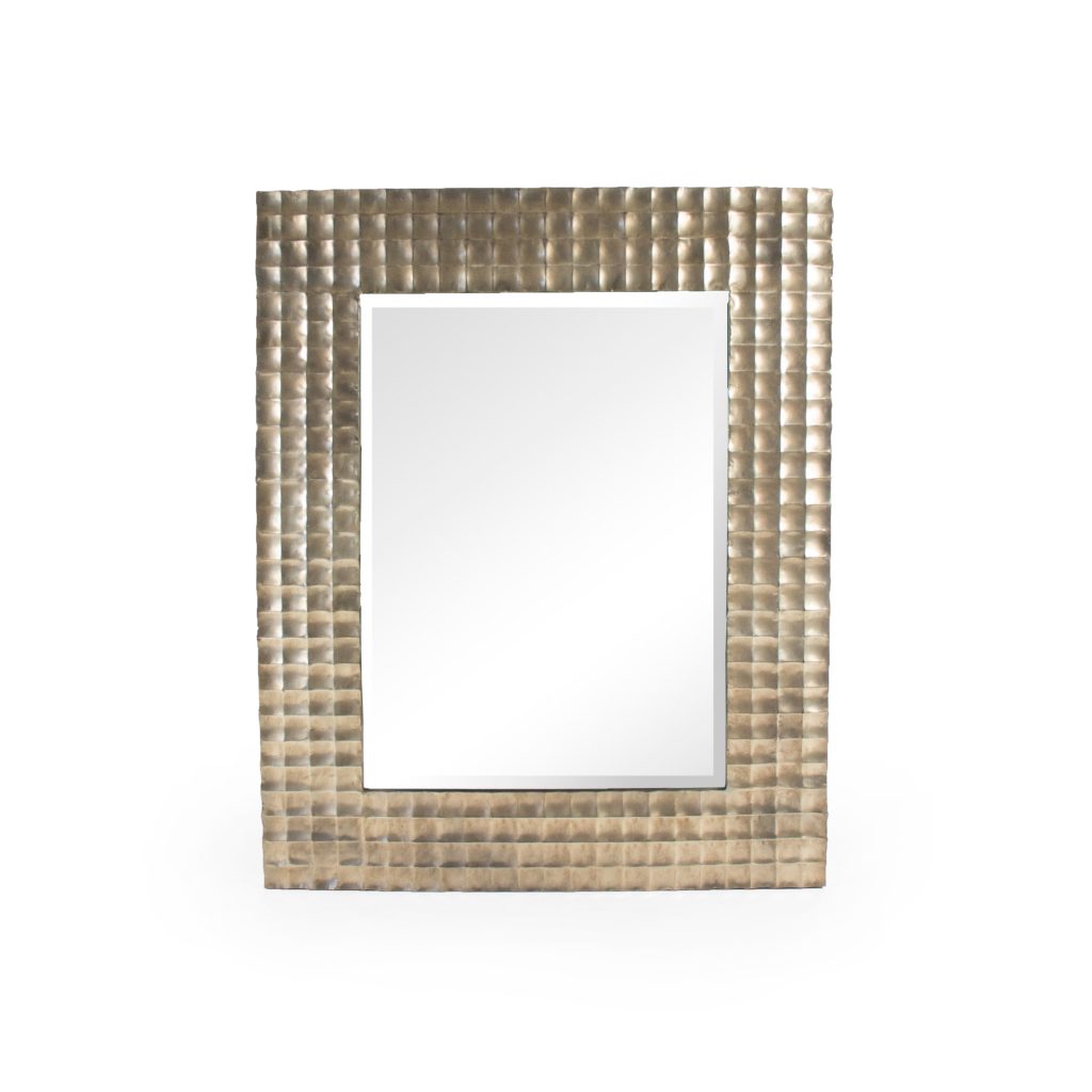 - The Frame: The mirror is characterized by a wide iron frame showcasing a unique squared texture. This hand-applied detail is finished in a warm Distressed Gold patina, providing a rich, multi-dimensional look that captures the essence of a storied, antique treasure.