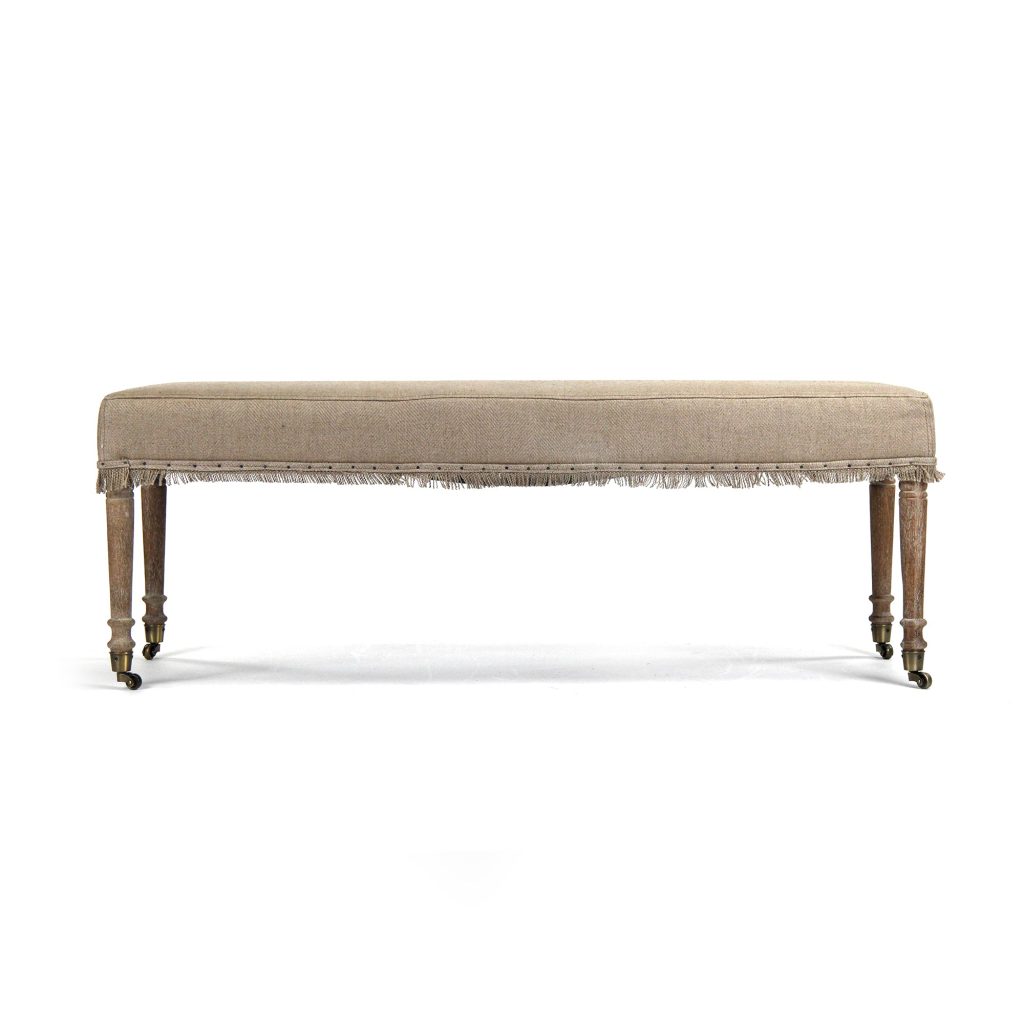 The Laurent Bench brings delicate refinement to spaces through thoughtful proportion and quality materials. Limed gray oak (E272) frame with hemp linen (H009) upholstery creates a composition that honors craft tradition while speaking to contemporary sensibility. At 50.5″ wide and 18.5″ tall, with a subtle 17″ depth, this bench functions as an elegant seating solution without visual heaviness. The wheels on the legs—a thoughtful functional detail—offer mobility for seasonal refreshes and layout adjustments while remaining visually subtle. At 20 pounds, this piece is genuinely moveable.